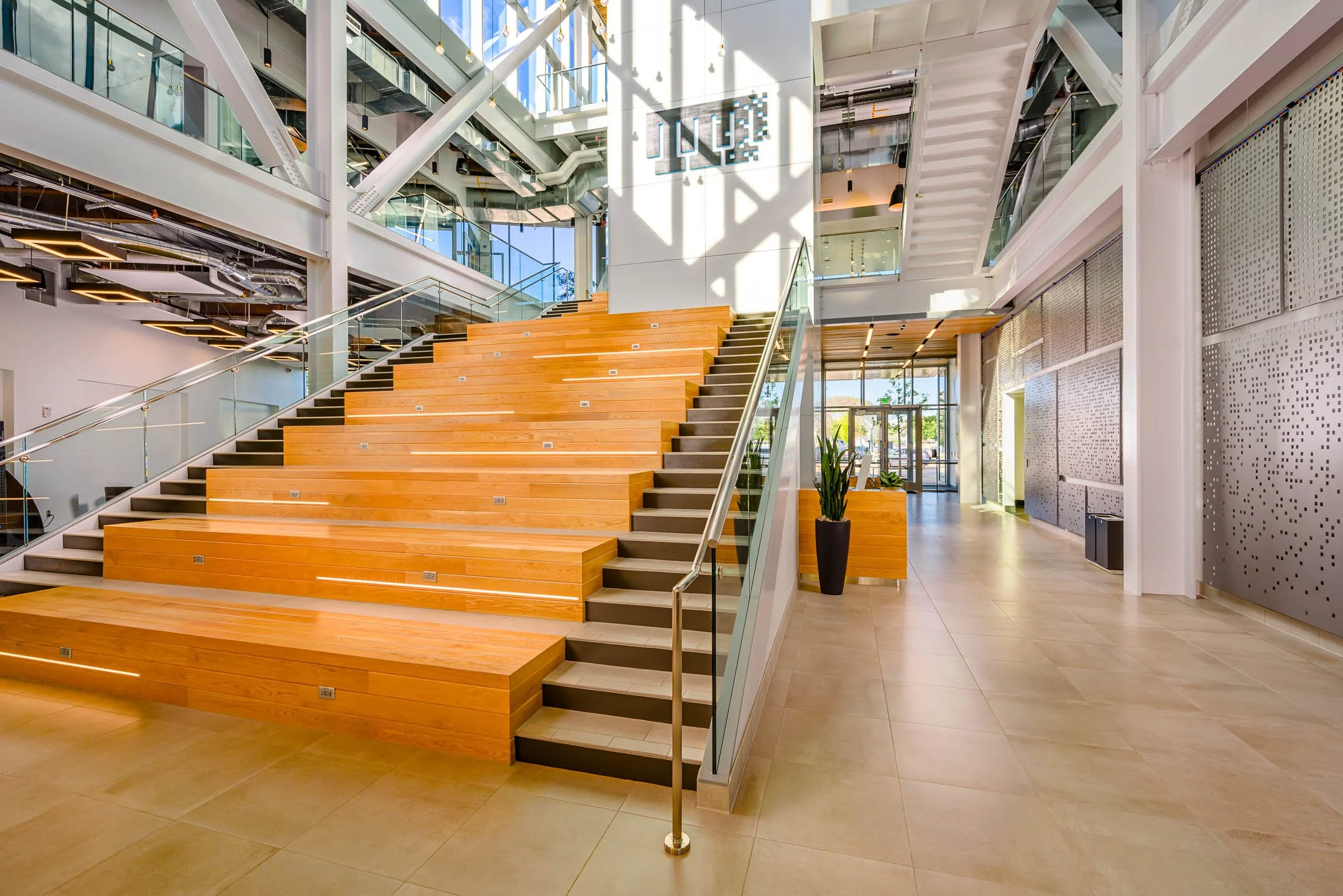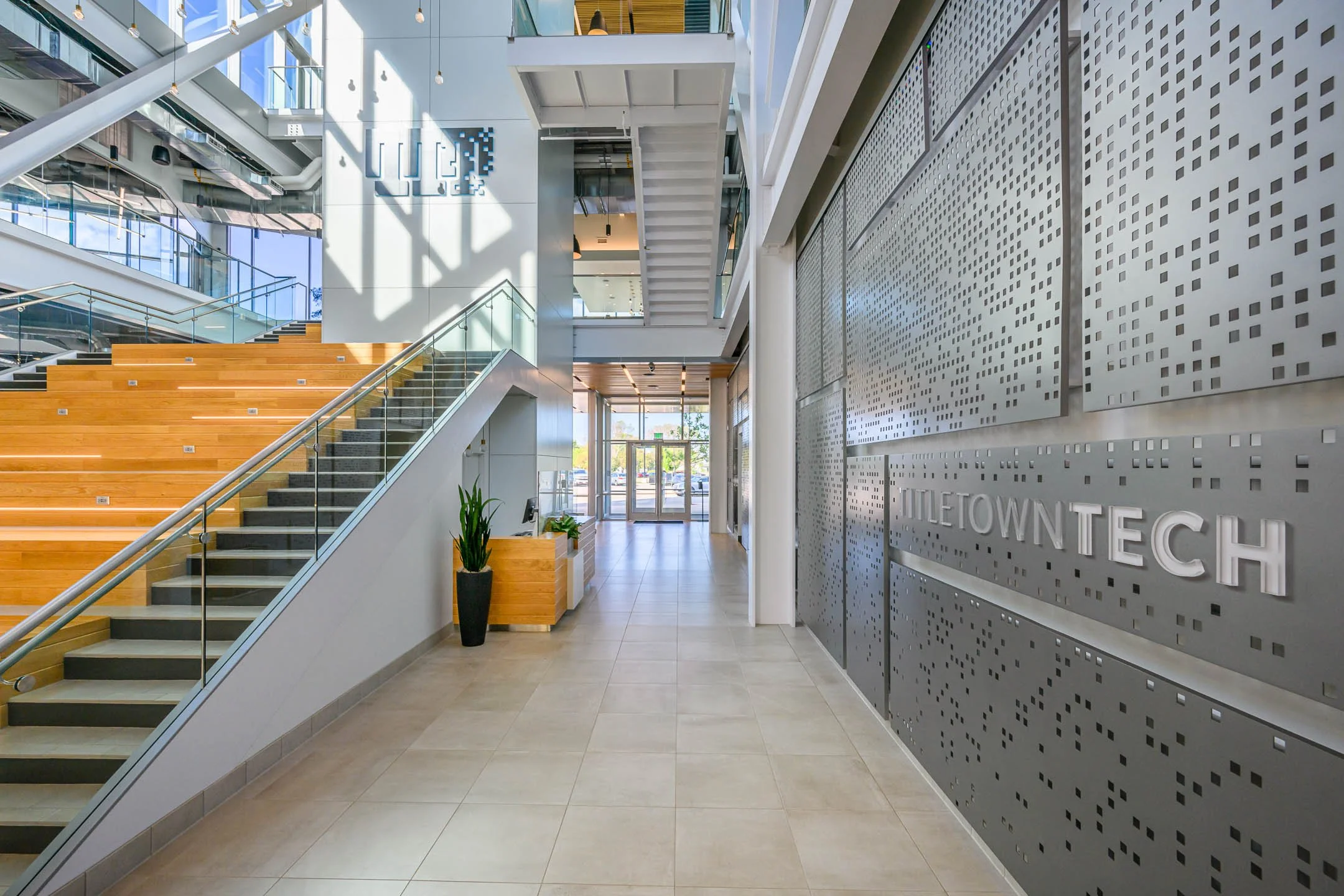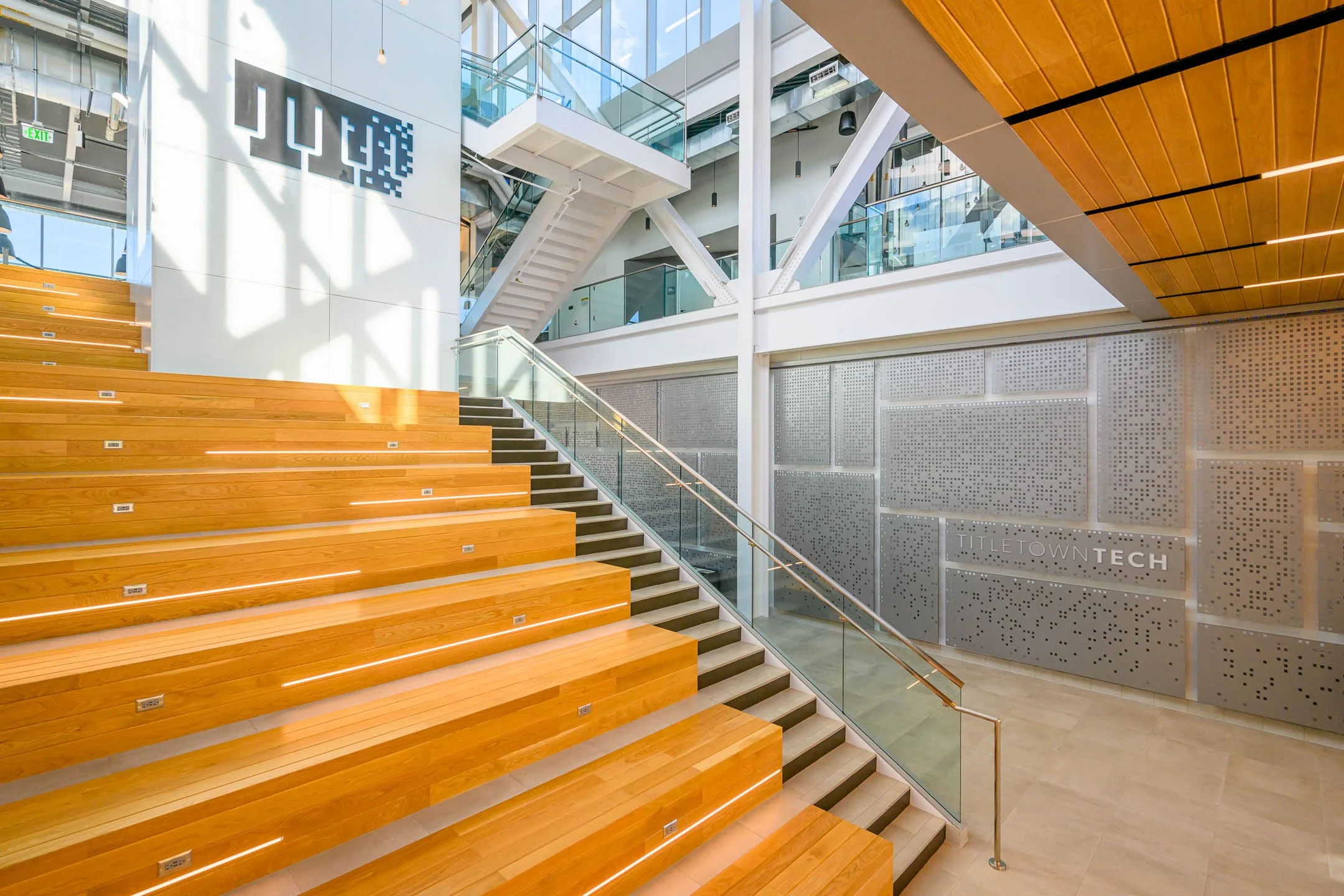 Stairs flank a bank of wooden bench seating where thinkers can openly collaborate and good ideas can congregate. The metal wall panels take their cue from the TitletownTech logo.