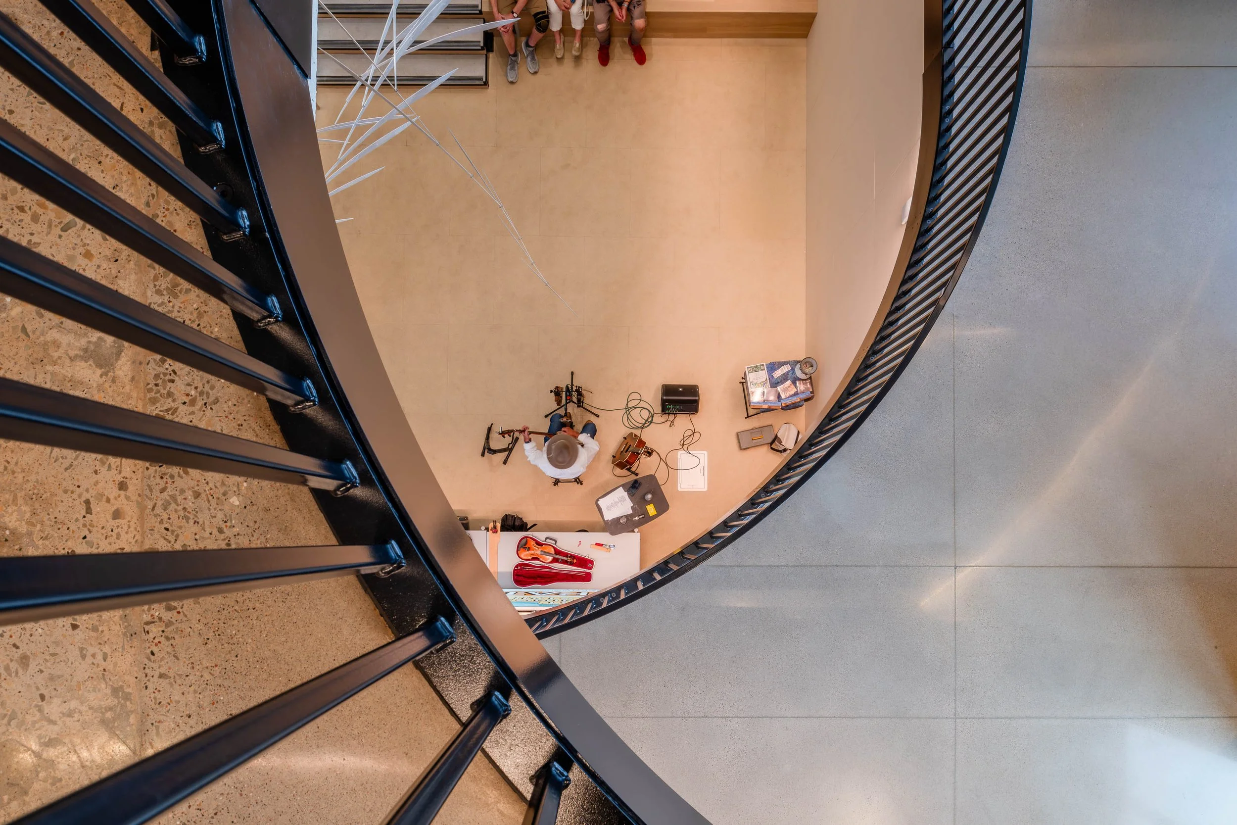 Lower Level: Learning stairs, children’s area, discovery/program rooms, and restrooms